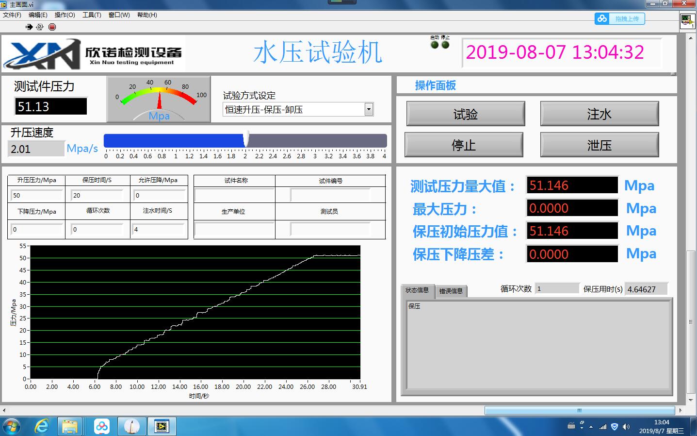◆实现计算机控制功能,可以自由设定充水排气时间、保压时间、充气清洗时间、试验压力实验过程中可以任意设定单段或者多段保压测试,也可以保压后直接爆破,升压速度能保持恒定,可实现无极调节,试验数据和曲线参数能实时显示、能自动保存试验结果、并可任意打印试验报表。(计算机控制)