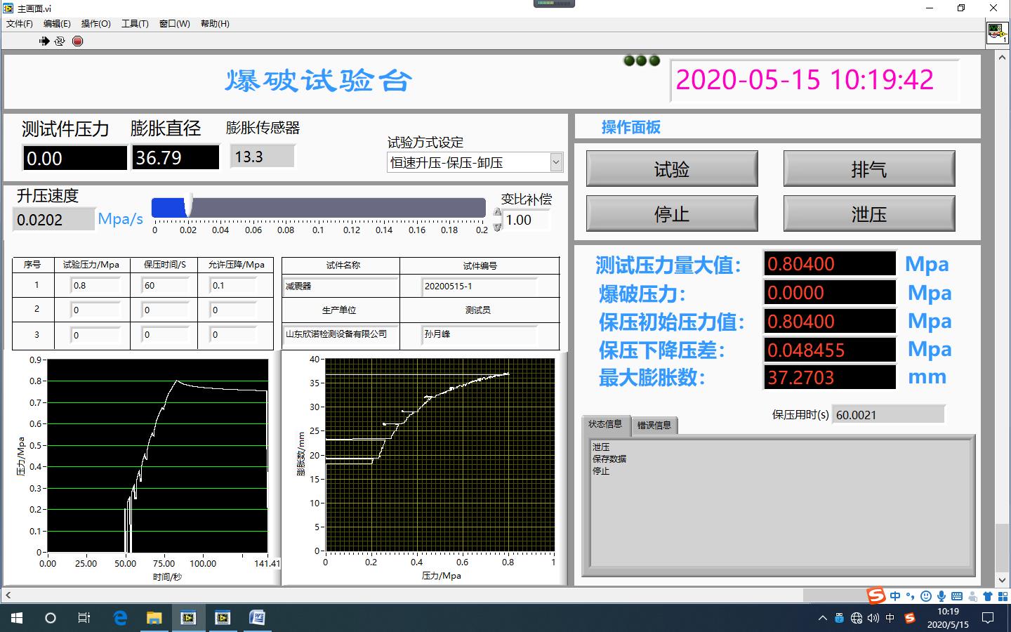 ◆实现计算机控制功能,可以自由设定充水排气时间、保压时间、充气清洗时间、试验压力实验过程中可以任意设定单段或者多段保压测试,也可以保压后直接爆破,升压速度能保持恒定,可实现无极调节,试验数据和曲线参数能实时显示、能自动保存试验结果、并可任意打印试验报表。(计算机控制)