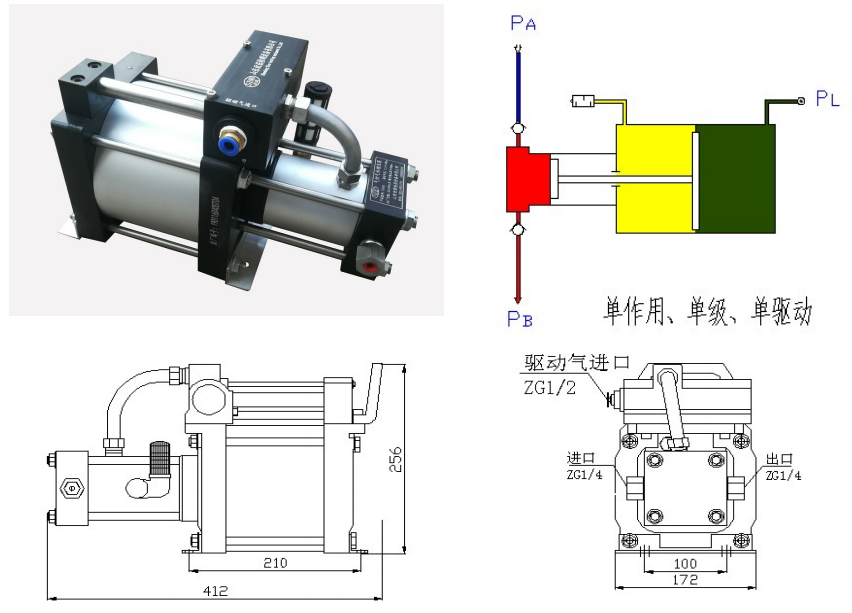 增压比 | 最小气体 入口压力PA(bar) | 最大气体 入口压力PA(bar) | 最大允许 出口压力PB(bar) | 气体出口 压力计算公式PB | 气体入口尺寸 | 气体出口尺寸 | 最大流量L/min @PL=6bar |